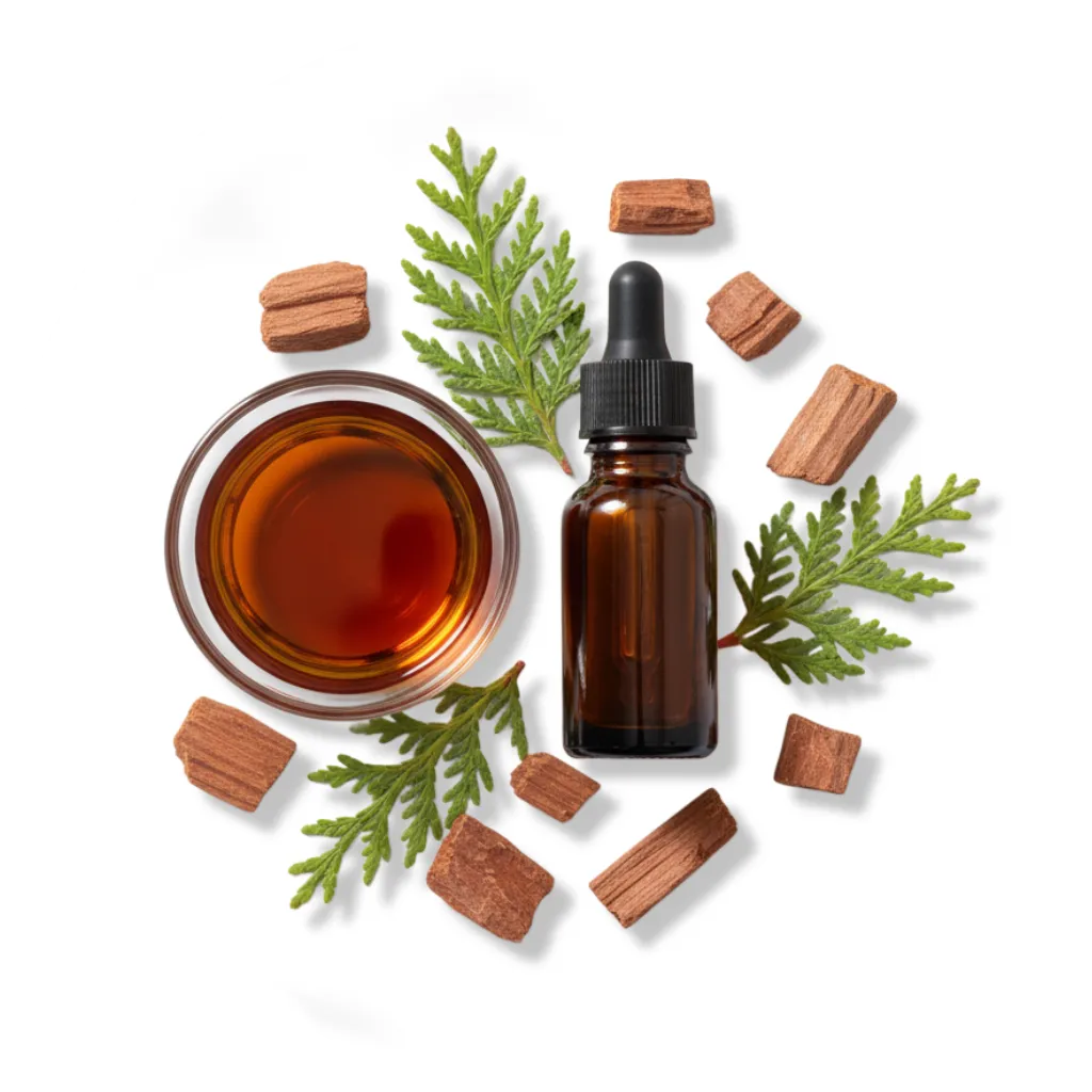 7. Cedarwood Essential Oil: Woody, grounding oil that supports skin healing, provides antimicrobial protection, and anchors the smoky forest blend.